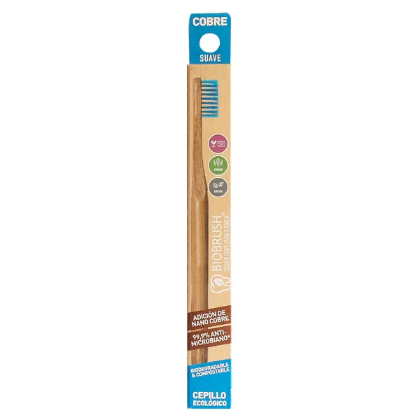 El Cepillo de dientes Biobrush Ultra Suave Azul es una excelente opción para quienes buscan un cuidado bucal suave y respetuso con el medio ambiente. Sus filamentos suaves y flexibles son ideales para una optima higiene bucal, mientras que su mango de bambú biodegradable y tecnología nano cobre garantizan una limpieza profunda y proteccción antibacterial que elimina el 99% de hongos y bacterias. Diseñado por odontólogos chilenos, este cepillo es vegano, compostable y libre de BPA. ¡Renueva tu rutina dental, cuida tu cuerpo y el planeta!.
